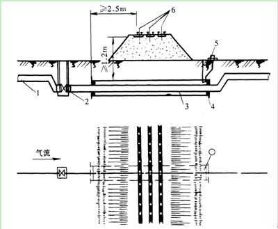 圖5-5 燃氣管道穿越鐵路1-燃氣管道;2-閥門;3-套管;4-密封層;5-檢漏管;6-鐵道二、穿越公路