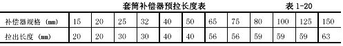 3.6.2套筒補(bǔ)償器的預(yù)拉伸長度應(yīng)根據(jù)設(shè)計要求,設(shè)計無要求時按表l-20要求預(yù)拉伸。預(yù)拉伸時,先將補(bǔ)償器的填料壓蓋松開,將內(nèi)套管拉出預(yù)拉伸的長度,然后再將填料壓蓋緊住。