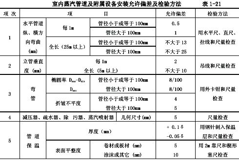 室內(nèi)蒸汽管道及附屬裝置安裝允許偏差及檢驗(yàn)方法見表1-21。