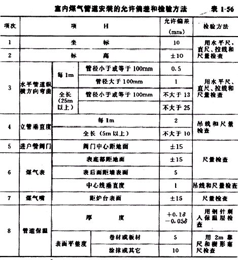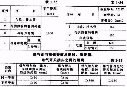 4.1.4煤氣引入管和室內(nèi)煤氣管道與其它各類管線、電力電纜、電線和電氣開關(guān)的最小水平、垂直和交叉凈距,必須符合設(shè)計(jì)要求或表l-53~表1-55的規(guī)定。