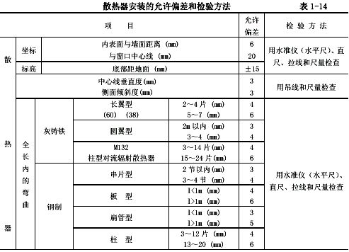 散熱器安裝位置按設計要求確定,設計無要求時自定安裝位置應一致;掛裝散熱器距地高度按設計確定,設計無要求時,一般不低于150mm,但明裝散熱器上表面不得高于窗臺標高。散熱器安裝坐標、標高等允許偏差和檢驗方法見表l-14。