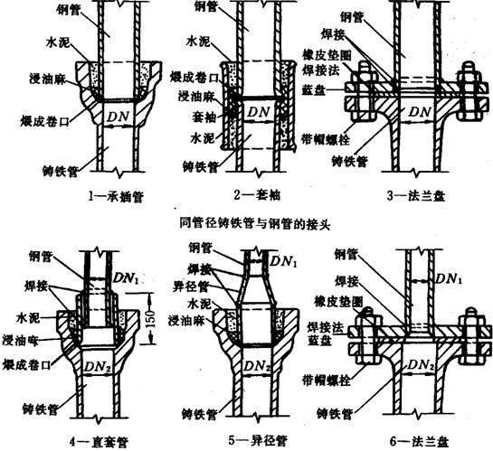 3.4.1.4給水鑄鐵管與鍍鋅鋼管連接時(shí)應(yīng)按圖3.4.1.4的幾種方式安裝。