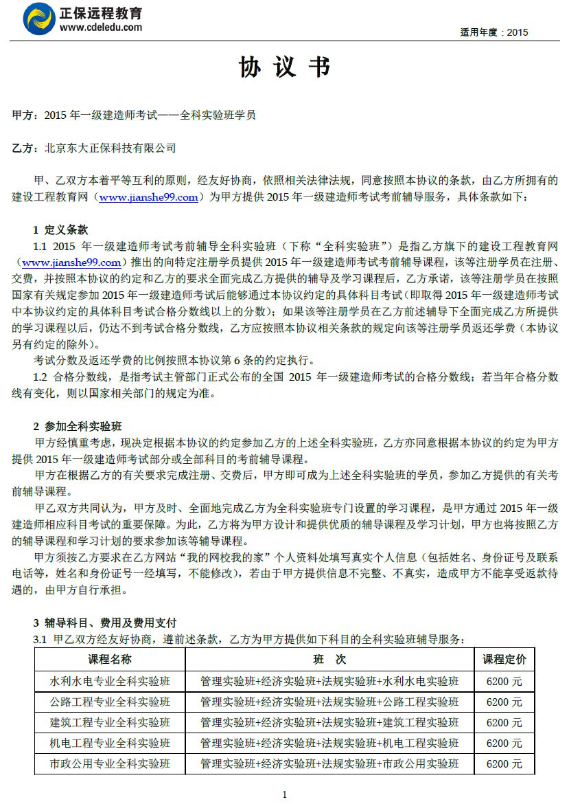 一級(jí)建造師“全科實(shí)驗(yàn)班”協(xié)議書