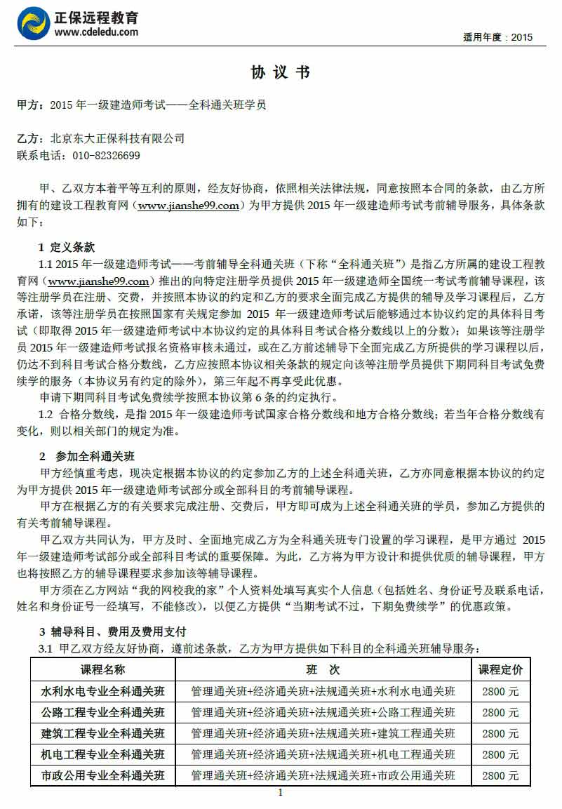 一級建造師“全科通關(guān)班”協(xié)議書
