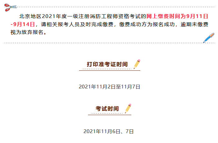 北京地區(qū)2021年度一級注冊消防工程師資格考試的網(wǎng)上繳費時間為9月11日-9月14日,請相關(guān)報考人員及時完成繳費,繳費成功方為報名成功,逾期未繳費視為放棄報名。