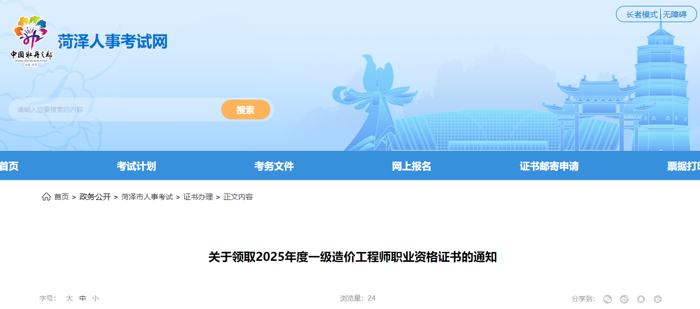 山東菏澤市2025年度一級造價工程師考試合格證書領取通知