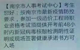 2021南京一級造價師考試即將來臨,面對再次席卷而來的疫情,各地都紛紛采取了相應(yīng)的疫情防控措施。那么南京市一級造價師考試有關(guān)疫情防控有什么新的政策和措施嗎?根據(jù)考生提供的短信截圖,我們獲取了南京市人事考試中心最新的疫情防控要求,內(nèi)容如下: