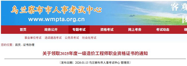 內(nèi)蒙古省烏蘭察布市2025年度一級(jí)造價(jià)工程師資格證書領(lǐng)取通知