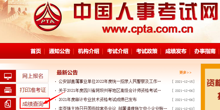 1、打開中國人事考試網(wǎng),點擊左側(cè)的“成績查詢”;