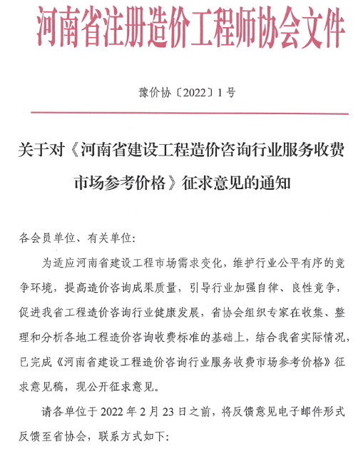 關于對《河南省建設工程造價咨詢行業(yè)服務收費市場參考價格》征求意見的通知