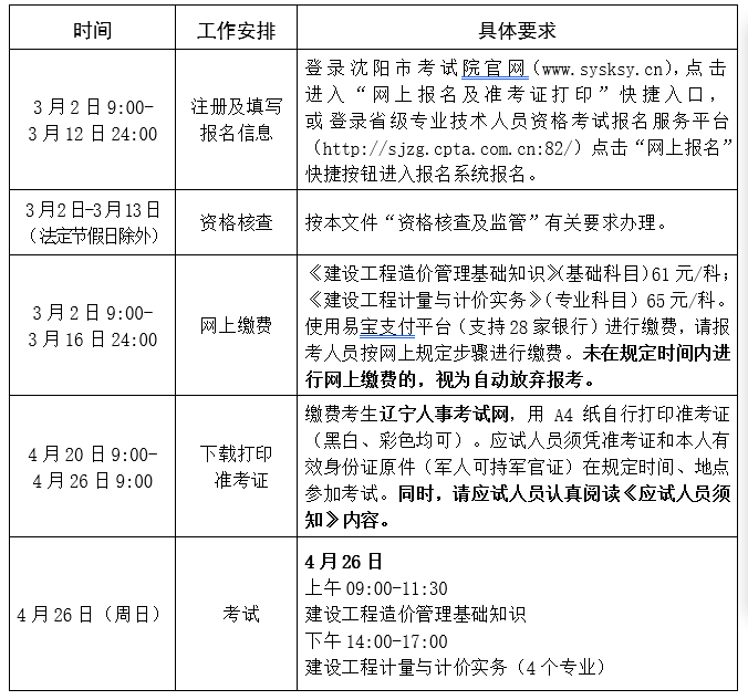 沈陽考區(qū)2026年度二級造價工程師職業(yè)資格考試報名工作的通知已發(fā)布,3月2日9時-3月12日24時登錄沈陽市考試院官網(wǎng)(www.sysksy.cn)或登錄省級專業(yè)技術人員資格考試報名服務平臺(http://sjzg.cpta.com.cn:82/)進行報名;3月2日-3月13日(法定節(jié)假日除外)資格核查;3月2日9時-3月16日24時網(wǎng)上繳費;4月20日9時-4月26日9時準考證打?。?月26日(周日)舉行考試;詳情如下: