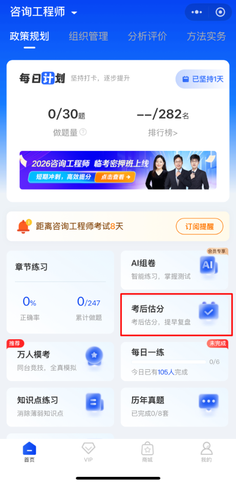 方式二:微信搜索“正保刷題寶”小程序,選擇咨詢工程師,點(diǎn)擊“考后估分”進(jìn)入-選擇要估分的科目進(jìn)行估分。