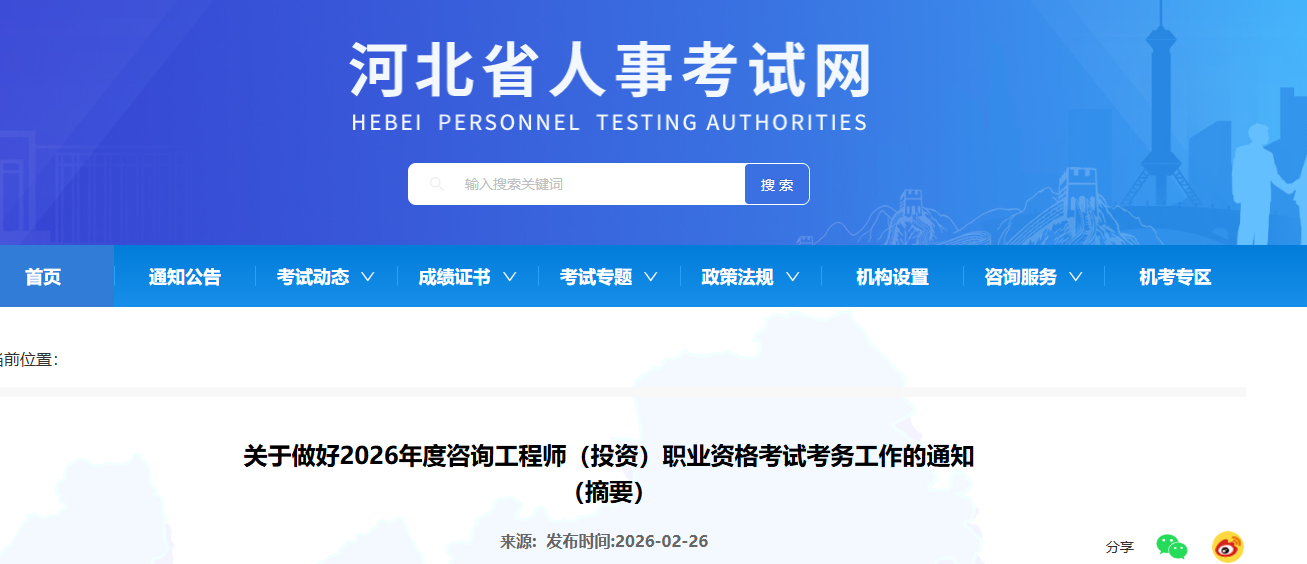 河北發(fā)布關(guān)于做好2026年度咨詢(xún)工程師(投資)職業(yè)資格考試考務(wù)工作的通知